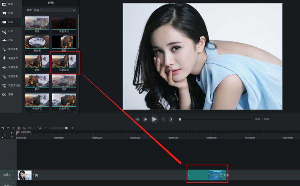 5、找到Camtasia 9內置的轉場選項,在Camtasia 9轉場選項中選擇“頁面滾動”轉場給兩個素材中間過渡位置添加。