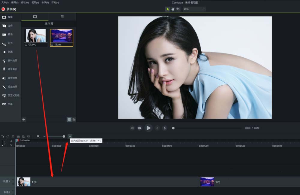 4、將導入的兩張圖片素材都拖到時間軸的同一個軌道中,并點擊放大時間軸。
