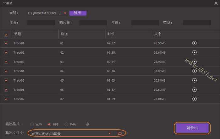 輸出選項卡中選擇輸出文件夾。最后,點擊將CD轉換到音頻文件按鈕以開始將CD轉換到音頻文件,且不會降低其質量。
