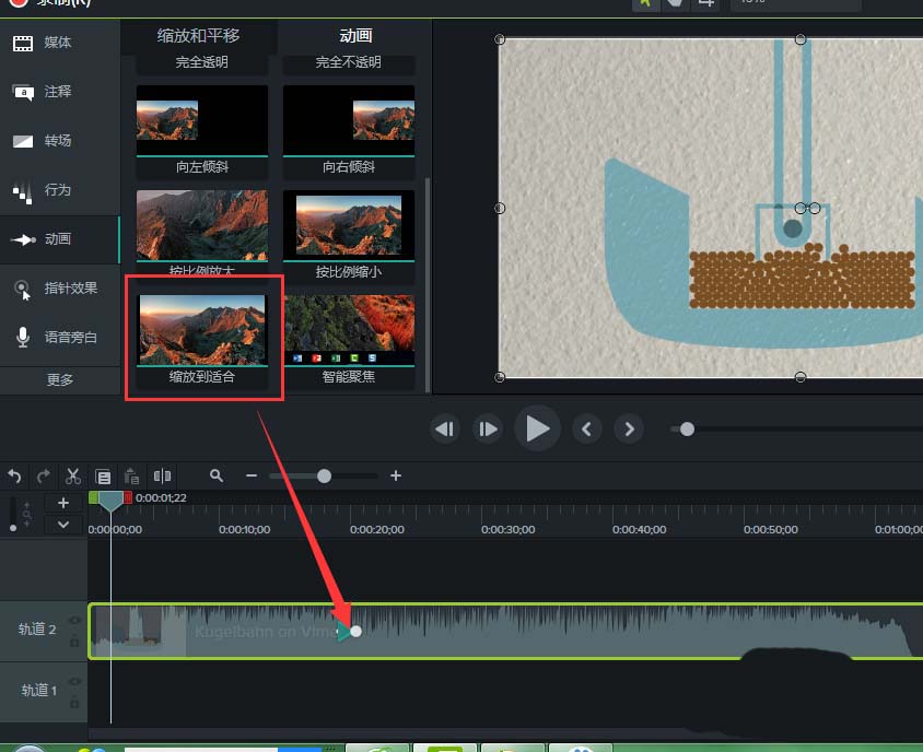 4、選擇動畫頁面,在動畫中找到“縮放到合適”這個動畫效果,將這個縮放到合適動畫移到軌道媒體文件上。