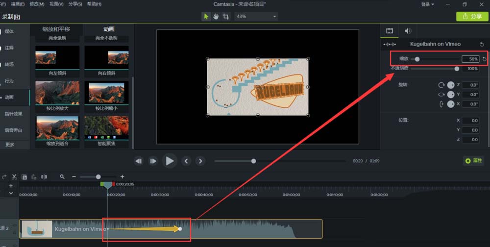 5、在軌道媒體上調整縮放到合適動畫的時長,單擊動畫的開始,在屬性中設置縮放的數值,這里我設置的是50%。