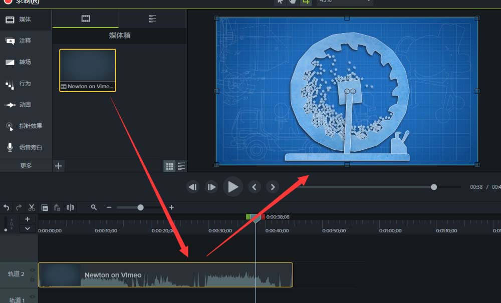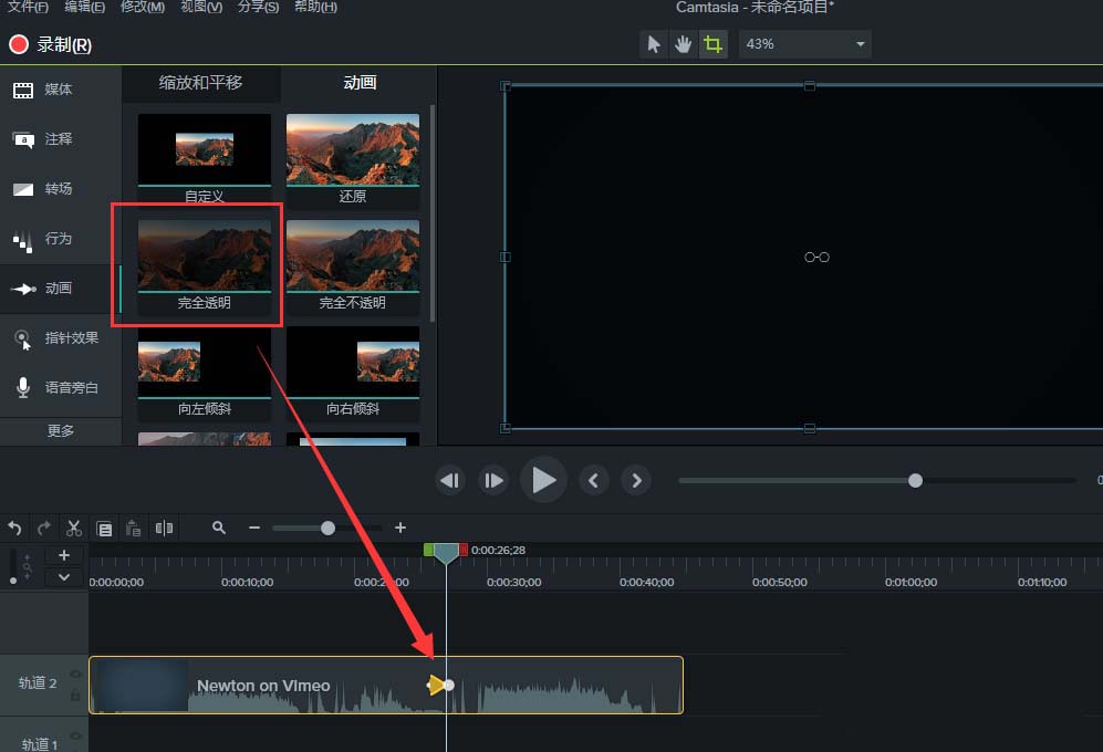 4、選中完全透明動(dòng)畫,按住鼠標(biāo)不松將這個(gè)完全透明動(dòng)畫效果添加到軌道2上的媒體文件上。