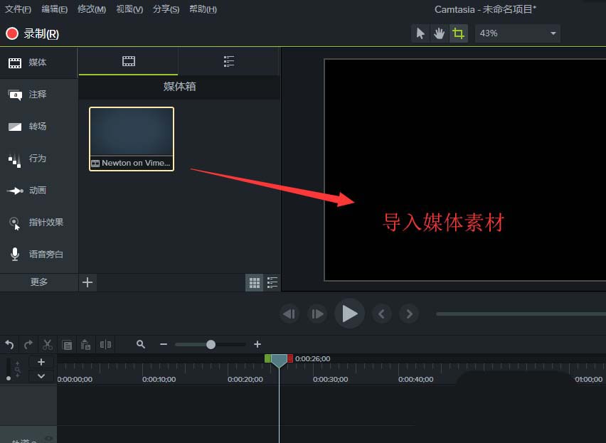 1、通過(guò)Camtasia 9軟件新建一個(gè)項(xiàng)目,然后執(zhí)行導(dǎo)入媒體選項(xiàng),導(dǎo)入一個(gè)素材媒體文件。