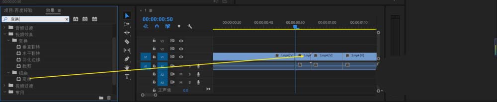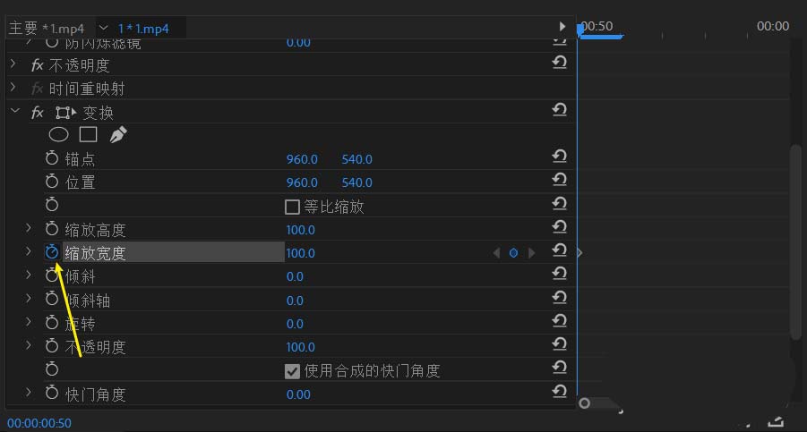 2、找到變換,拖到第一個切割塊上,找到左邊的控件,把等比縮放的勾去掉,順便把寬度打上關鍵幀