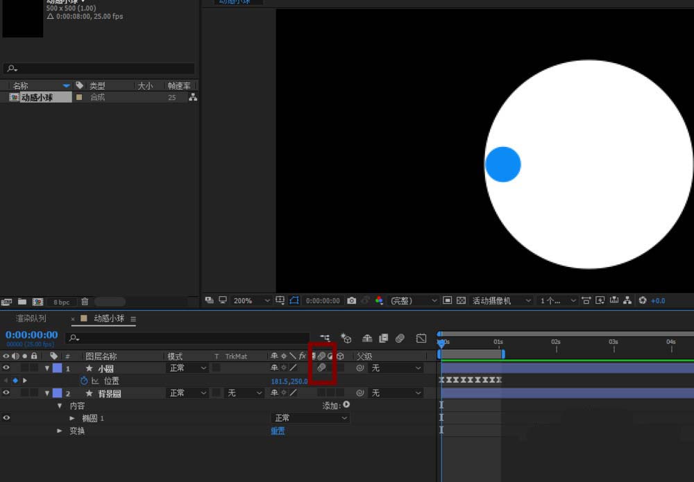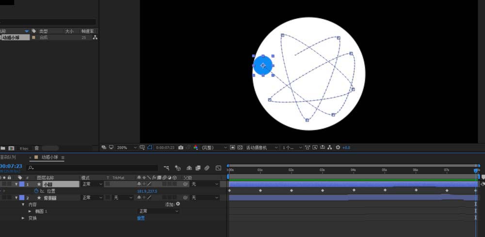 4、接下來我們需要做小圓在大圓范圍內(nèi)的運動路徑了,選中小圓按下P鍵,給位置屬性K幀,在k位置的幀的時候,要注意小球要貼合大球內(nèi)壁,讓它有落地的感覺。