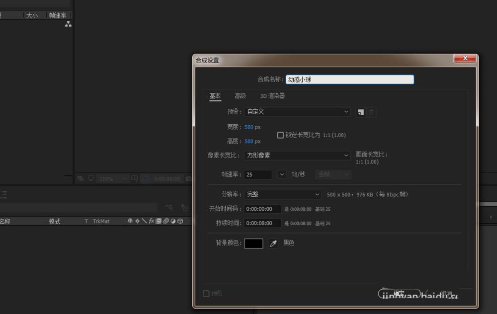 1、打開AE軟件,新建合成命名動感小球,調整相應的參數(shù)。