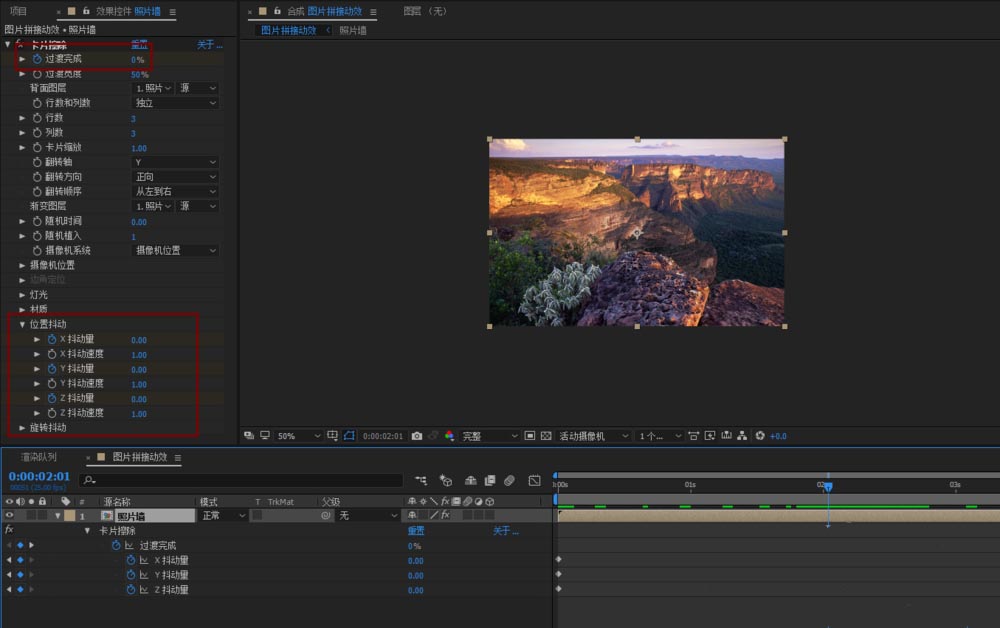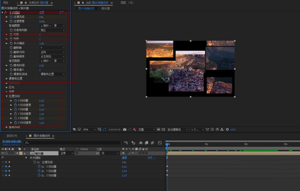 5、選中預(yù)合成,添加卡片擦除效果;設(shè)置參數(shù);給位置抖動和過渡完成K關(guān)鍵幀,實現(xiàn)動畫;