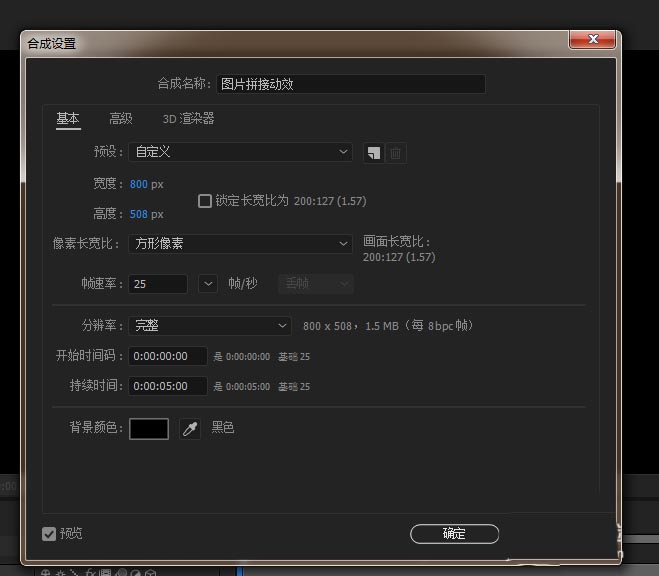 1、打開AE軟件,新建合成,命名圖片拼接動效,調(diào)整相應(yīng)的參數(shù)。