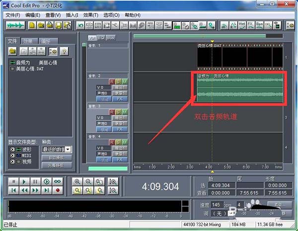 3、點(diǎn)擊“打開”后,視頻就插入進(jìn)來了。我們雙擊音頻軌,如圖所示。