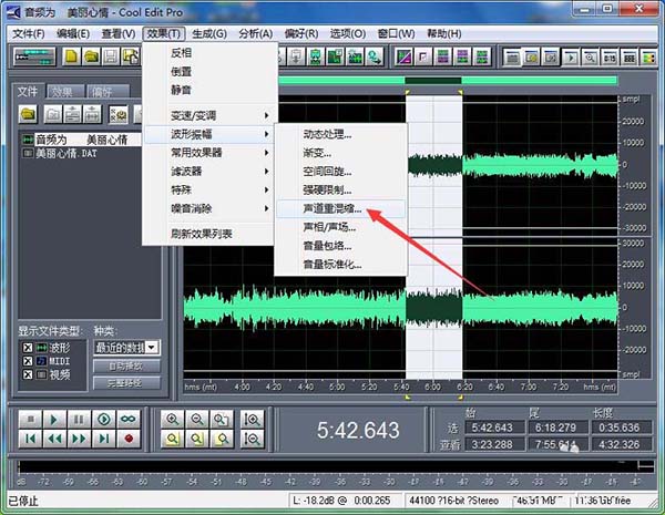 4、進(jìn)入單軌編輯模式。我們需要在音頻中間選取一小段來測(cè)試。如圖,選取一小段音頻,依次點(diǎn)擊“效果”—“波形振幅”—“聲道重混編”。