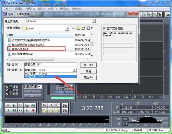 2、視頻MV的格式有很多,需要時(shí)cooledit軟件支持的格式。小編這里選擇的是dat格式,也是支持的。