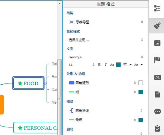 3)根據自己的需要,利用主題格式、畫布格式等視圖窗口修改思維導圖的風格格式,以滿足自己的需求。