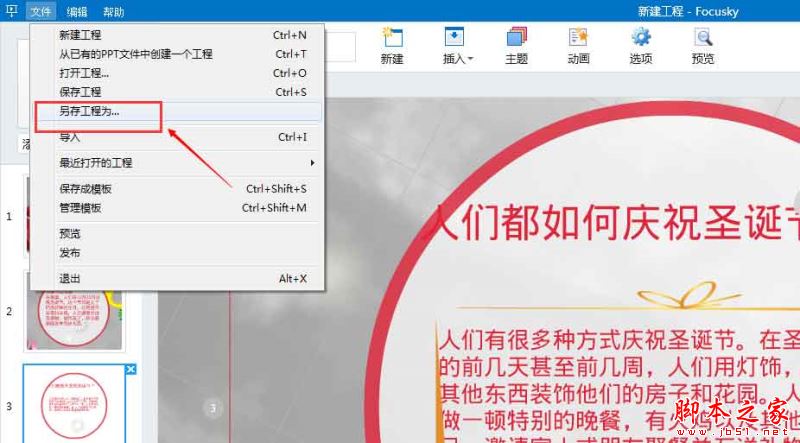 3.當(dāng)你下一次打開(kāi)工程時(shí),點(diǎn)擊左上角的“文件”,打開(kāi)“另存工程為……”,如下圖出現(xiàn)一個(gè)窗口,在里面即可找到重命名的多媒體。