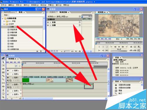 11、對音頻的特效處理和視頻一樣,在特效窗口中找到具體的特效拖拽到相應的音頻軌道上,在監(jiān)視器中的特效控制中進行設置具體的內容。