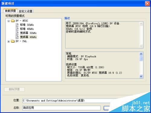 3、進入新建項目對話框,在該對話框中選擇可用的預置模式,通常情況下我們選擇寬銀幕48khz,接著選擇存儲的位置并輸入名稱為“高級應用”點擊確定按鈕。