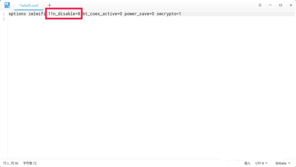 6、如果網速沒有變化的話也可以將:“options iwlwifi 11n_disable=1 bt_coex_active=0 power_save=0 swcrypto=1”中的“11n_disable=1”修改為“11n_disable=8”