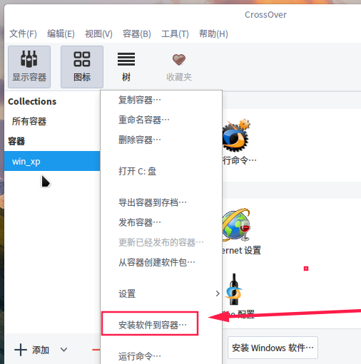 6、建立完成容器后,在左側新建的win_xp容器中,右鍵選擇“安裝軟件到容器”。
