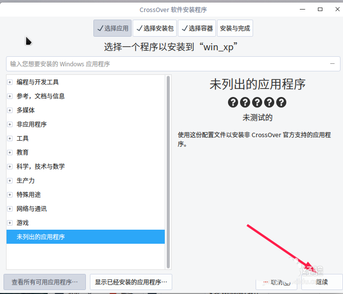 9、在新彈出的窗口選擇“未列出的應用程序”,然后點擊“繼續”。