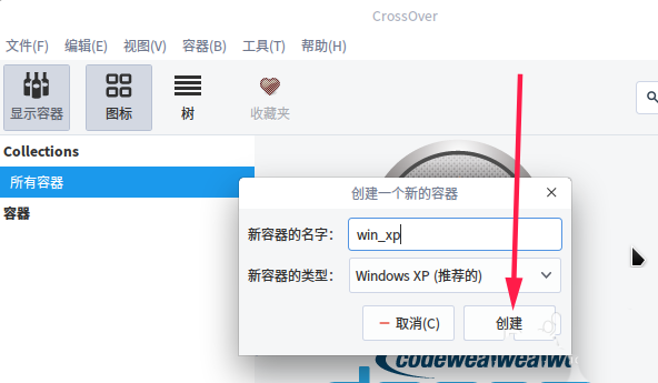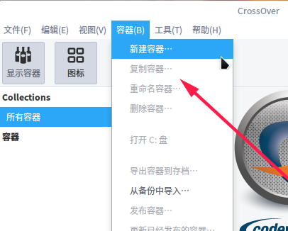 4、運行crossover后點擊“容器”——“新建容器”。
