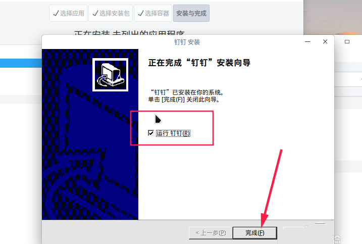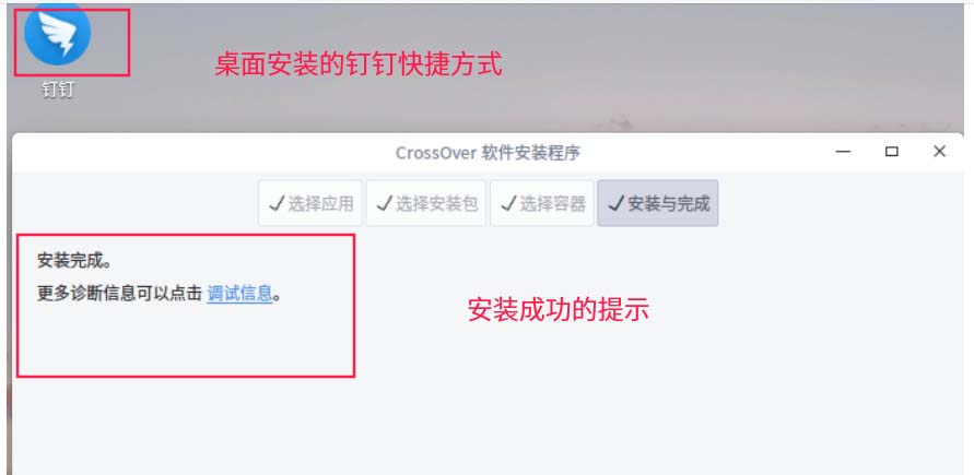 12、點擊“完成“后,會出現如下圖所示的內容,一個是完成安裝的提示信息,一個是桌面的釘釘圖標。