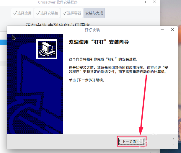 10、這時候就會看到釘釘的安裝提示,選擇“下一步”。