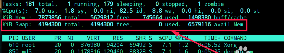 7、這時候執行top命令可以看到相應的swap分區信息。