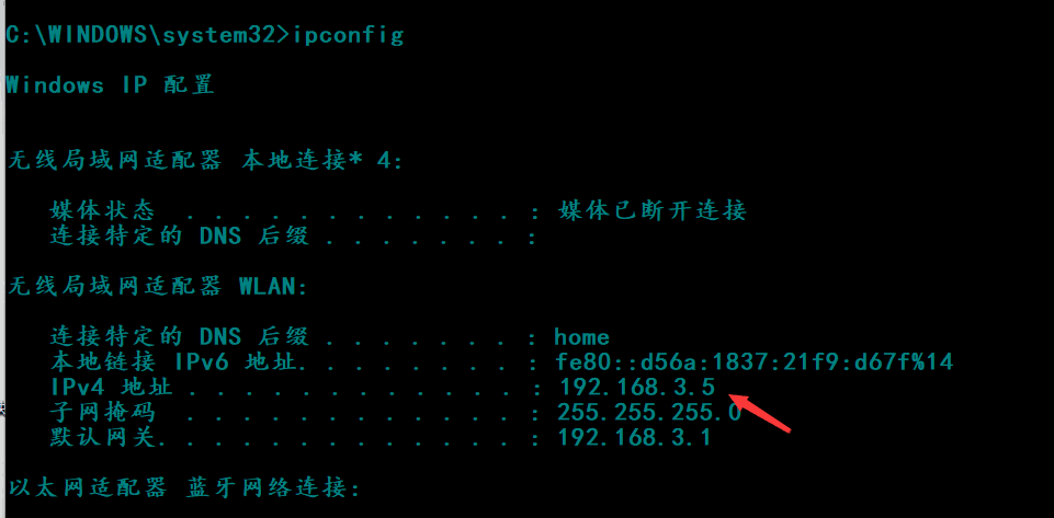 4、這時候查看一下windows機的ip地址,執(zhí)行ipconfig命令。