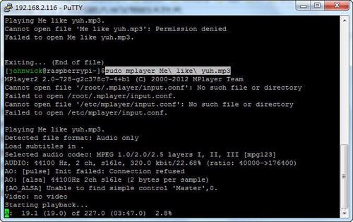 [johnwick@raspberrypi~]$sudo mplayer Me like yuh.mp3