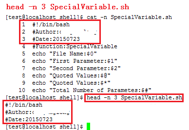 head -n 數字 文件名,表示查看文件前幾行的內容,比如查看SpecialVariable.sh的前3行內容,head -n 3 SpecialVariable.sh,如下圖