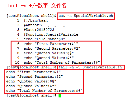 tail -n -數字 文件名,表示查看文件的最后幾行,比如查看SpecialVariable.sh的最后5行,tail -n -5 SpecialVariable.sh,如下圖