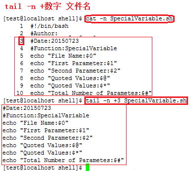 tail -n +數字 文件名,表示查看文件的某一行到最后一行,比如查看SpecialVariable.sh的第3行到最后一行,tail -n +3 SpecialVariable.sh,如下圖