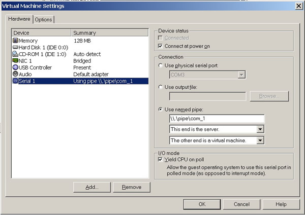 虛擬機中的串口連接可以采用兩種方法。一種是指定虛擬機的串口連接到實際的COM上,例如開發機連接到COM1,目標機連接到COM2,然后把兩個串口通過串口線相連接。另一種更為簡便的方法是:在較高一些版本的VMware中都支持把串口映射到命名管道,把兩個虛擬機的串口映射到同一個命名管道。例如,在兩個虛擬機中都選定同一個命名管道 //./pipe/com_1,指定target機的COM口為server端,并選擇"The other end is a virtual machine"屬性;指定development機的COM口端為client端,同樣指定COM口的"The other end is a virtual machine"屬性。對于IO mode屬性,在target上選中"Yield CPU on poll"復選擇框,development機不選。這樣,可以無需附加任何硬件,利用虛擬機就可以搭建kgdb調試環境。即降低了使用kgdb進行調試的硬件要求,也簡化了建立調試環境的過程。