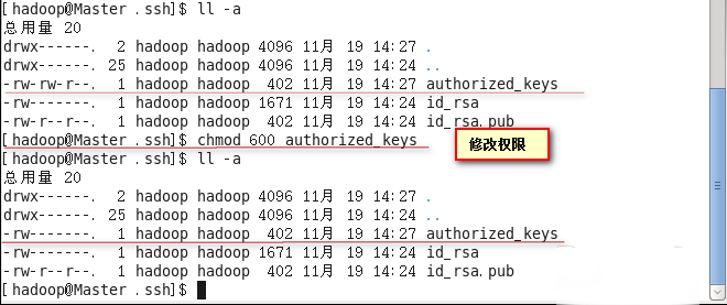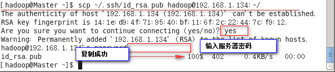 如: scp ~/.ssh/id_rsa.pub hadoop@192.168.1.134:~/
