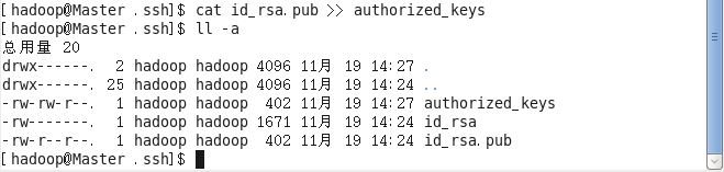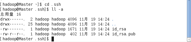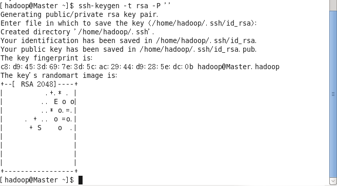 ssh-keygen –t rsa –P '' -->直接回車生成的密鑰對:id_rsa和id_rsa.pub,默認(rèn)存儲在"/home/hadoop/.ssh"目錄下。