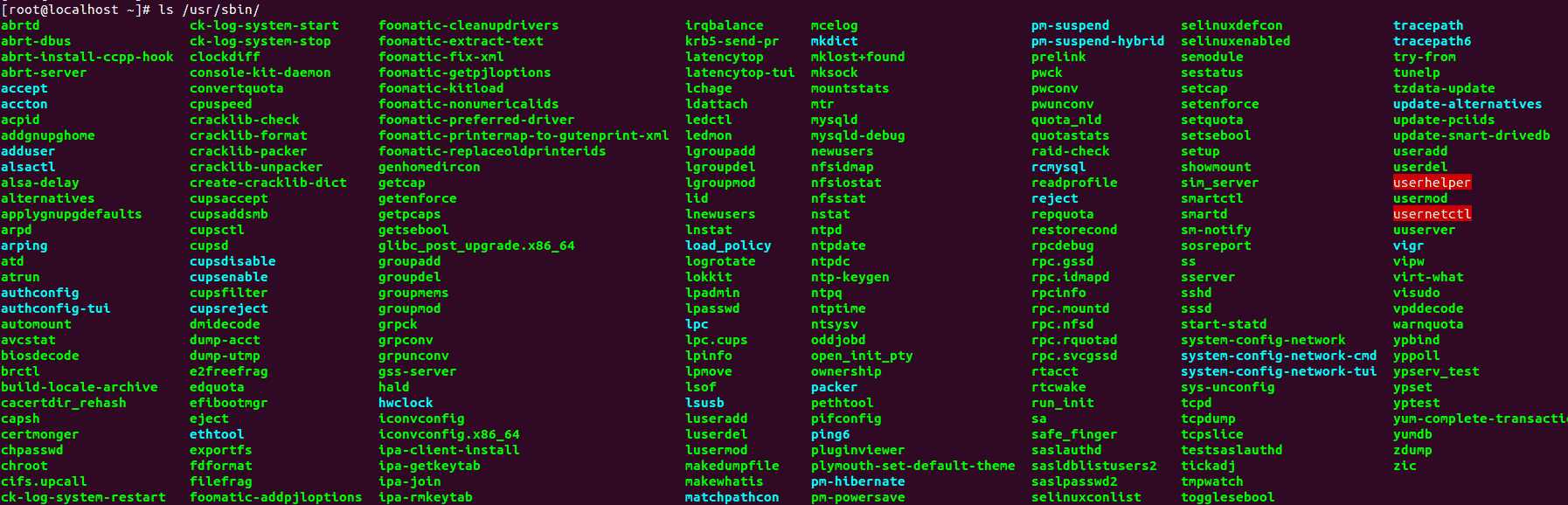主要放置一些系統管理的必備程序例如:cfdisk、dhcpcd、dump、e2fsck、fdisk、halt、ifconfig、ifup、 ifdown、init、insmod、lilo、lsmod、mke2fs、modprobe、quotacheck、reboot、rmmod、 runlevel、shutdown等。
