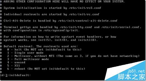 4、重啟后進入Linux系統,修改/etc/inittab文件。將init級別改成你想要的,比如我在這里改成3(完整多用戶模式)。