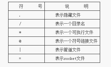 ls還會對特定類型的文件用符號進行標識,下表列出了常用的標識符號及其說明。