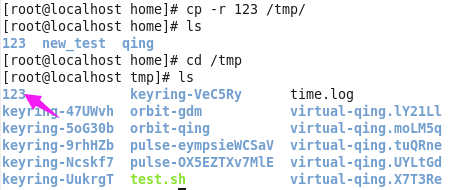 2、拷貝目錄123 到/tmp/目錄中,使用cp命令