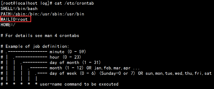 MAILTO=root 表示在執行某一個 crontab 命令或者任務的時候,都會生成一個記錄信息發送給 root 用戶