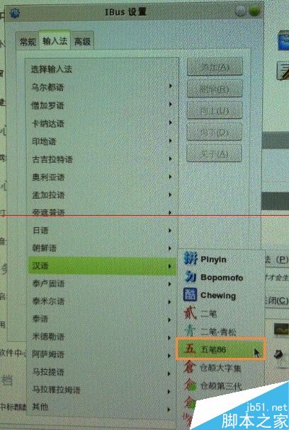 5、在上面的[選擇輸入法]下拉框中,找到[漢語]-[五筆86]
