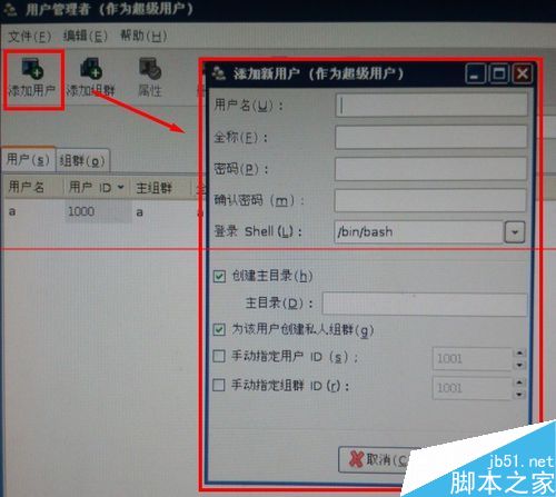 3、點擊添加用戶,然后在彈出的對話框中輸入新創(chuàng)建的用戶名稱,密碼。輸入完畢點擊確定后新用戶即可創(chuàng)建成功。