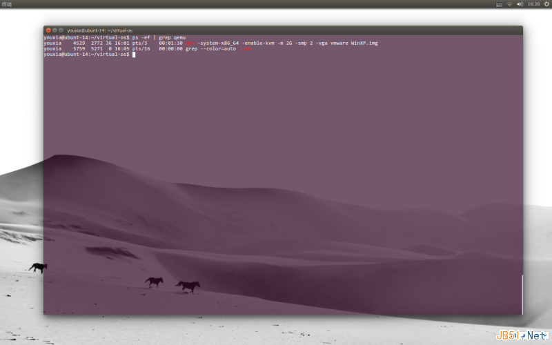 可以看出,使用KVM加速后,虛擬機中的WinXP運行速度提升了不少,開機只用了34秒。我將分辨率調整為1366*768,圖形界面運行也很流暢,不管是打開IE瀏覽器還是Office辦公軟件都沒有問題,再也沒有出現CPU使用率飆升到100%的情況。如果用 ps -ef | grep qemu 命令查看一下,發現kvm命令運行的還是qemu-system-x86_64程序,只不過加上了-enable-kvm參數,如下圖: