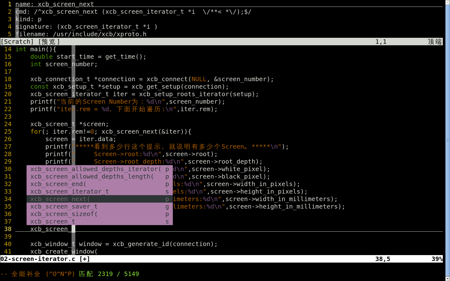 然后,在使用Vim寫C程序的時候,如果輸入了.、->這樣的元素,則其成員會自動補全。如果輸入的是一個字符串(比如函數名),可以按Ctrl-X Ctrl-O調用自動補全,如下圖: