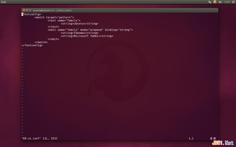 第六步,設置界面字體,將Ubuntu替換成Tahoma搭配微軟雅黑,文件名為69-ui.conf,內容如下圖: