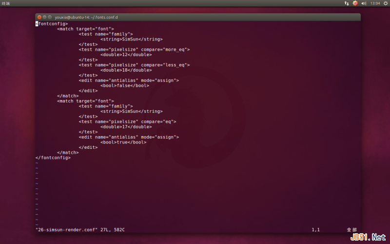 第二步,設置宋體在12px、13px、14px、15px、16px和18px的時候使用點陣,由于這是針對某個特定字體的配置,所以我取的文件名是26-simsun-render.conf。如下圖: