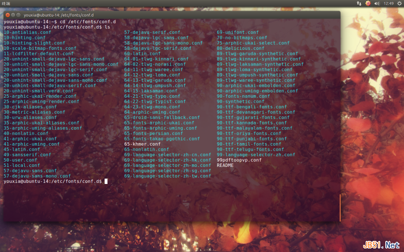 系統的配置文件,除了/etc/fonts.conf外,其余的配置文件都在/etc/fonts/conf.d目錄中。進入該目錄ls一下,可以看到配置文件還真不少,其中每一個文件前面都有一個編號。如下圖: