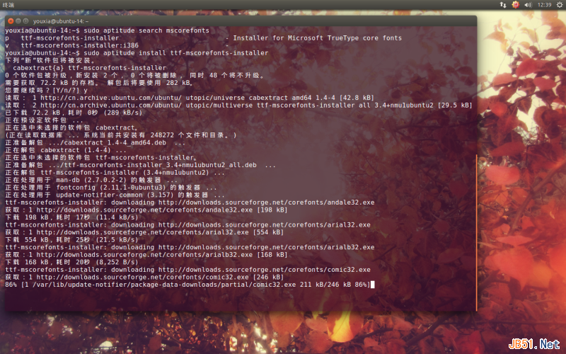 微軟是一個很不錯的公司,它將其系統中使用的幾套英文字體如Arial、Verdena等開放了,可以供大家免費使用。當然,這些開放的字體中不包含Tahoma和Consolas。在Ubuntu中,可以直接從軟件源中安裝ttf-mscorefonts-installer,該軟件安裝的時候會自動下載安裝微軟提供的幾套英文字體。如下圖: