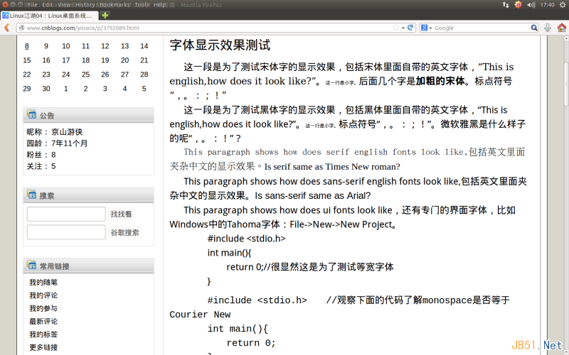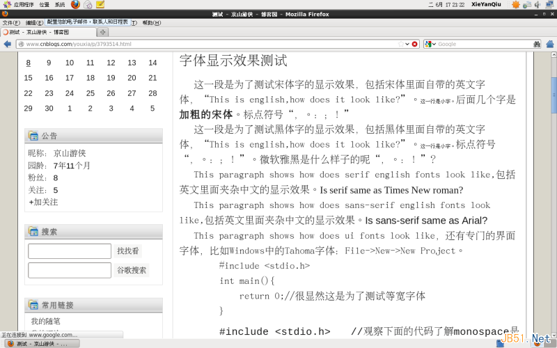 下面來看看Ubuntu中的顯示效果。從下圖中可以看到,Ubuntu側重于sans-serif和黑體,除了明確指定serif和Times New Roman的字體外,其余全部顯示為sans-serif和黑體。而且沒有點陣。這進一步印證了我前面說的黑體適合屏幕顯示、宋體適合打印和印刷。在系統中全部顯示黑體雖然不會丟失文字的信息,但是肯定會影響美觀。Ubuntu沒有正確地為monospace選擇等寬字體,但是對Courier New倒是選擇了一個很漂亮的等寬字體進行替代。