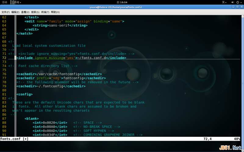 配置Fedora 20 Fontconfig首先讀取的配置文件是/etc/fonts/fonts.conf,然后,根據/etc/fonts/fonts.conf里面的<include>...</include>信息來加載其它的配置文件。Fedora 20默認是加載/etc/fonts/conf.d目錄下的所有文件。當然,/etc/fonts/conf.d目錄下的文件太多了,引入了很多其實沒有必要的復雜性。對于我這種追求簡潔的人,我直接就把它改了,讓/etc/fonts/conf.d下的文件去見鬼,從我自己的主目錄的fonts.conf.d目錄下加載配置文件吧。如下圖,我注釋掉了第71行,增加了第72行: