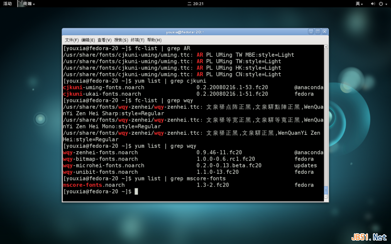 查看Fedora 20系統,可以看到它還是安裝了AR PL UMing,也就是宋體,但是它沒有使用,而且它沒有安裝楷體,雖然它的軟件源中有cjkuni-ukai。它使用的黑體是文泉驛系列。